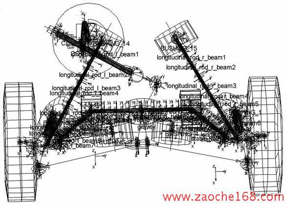 汽车前悬架采用麦克弗逊式独立悬架,转向系统采用齿轮齿条式转向器,如图5.1 所示根据实际悬架及转向系统结构,抽象出前悬架及转向系统分析模型,左、右悬架对称。整个前悬架及转向系统包括:摆臂(2 个)、转向节(2 个)、转向横拉杆(2 个),减振器上半部分(2 个),减振器下半部分(2 个),中央摇臂(1 个),斜拉杆(1 个),转向下轴(1 个)、转向上轴(1 个),转向盘(1 个)、转向齿条(1 个),车身(1 个),纵拉杆、横向稳定杆采用ADAMS 软件中的离散体( DISCRETE FLEXIBLE LINK)概念,将横向稳定杆及纵拉杆进行离散化,分成几小块,块(刚体)与块连接处用BEAM 梁来连接,BEAM梁的刚度、 阻尼矩阵由ADAMS 软件根据截面形状及材质自动计算得出,这里横向稳定杆分成三个物体,每个物体由8 小块组成,共24 块。纵拉杆由8 小块柔性体组成,共57 个物体组成。其中减振器上半部分通过球形铰链与车身相接,它相对车身可进行前后左右两个方向的转动。转向节通过圆柱铰与减振器上半部分相连,它相对减振器上半部分可进行轴向移动和转动。摆臂一端通过转动铰与车身相连,使其可相对车身上下摆动,另一端通过球形铰链与转向节相连。转向横拉杆一端通过球铰与转向节相连,另一端通过万向节铰链与中央摇臂相连,中央摇臂另一端通过球铰与斜拉杆相连,约束了其绕自身轴线的转动。中央摇臂中心轴通过转动铰与车体相连,斜拉杆与齿轮齿条通过万向节铰链相连,转向下轴通过转动铰链与车身相连,转向上轴与转向盘通过固定铰链相连,并与车身通过转动铰链相连,转向上下轴通过耦合来连接,转向齿条通过移动铰与车身相连,它可相对车身斜向移动,转向下轴与齿轮齿条通过耦合来连接。