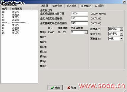 温度控制部分的实现 成型机的加热系统由6组加热管组成,由温控器和固态继电器来控制。 永宏PLC根据控制过程的需要,配合永宏的其它功能模块,灵活组合,可以实现多种控制需求。单台主机可以实现32路的温度测量,并有最常用的热电偶及白金电阻等2大类共5种温度模块,选取永宏的8EAT晶体管输出部分和温度采集模块TC6,经由温度PID控制指令FUN:TPCTL来实现成型机的恒温控制。 温度PID控制利用温度模块配合温度规划表格将成型机加热盘内的当前温度同设定值进行比较,依据存在的偏差,经由软件PID数学式运算后,将运算结果转换为时间比例ON/OFF(PWM),由晶体管输出点输出控制SSR所推动的加热回路,从而使加热盘内的温度保持在SV±1℃。 TC模块的温度采集由温度规划表格来实现,如下图: