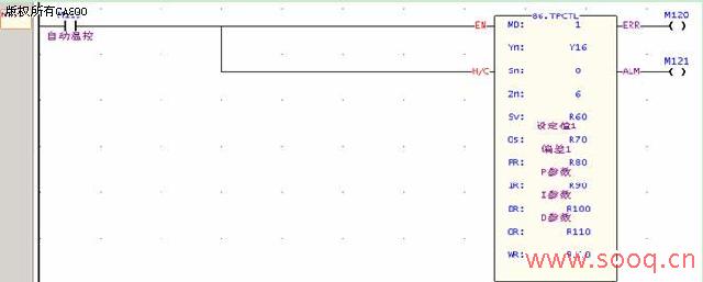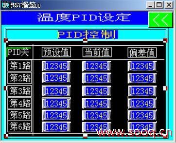 6路温度的采集由K型热电偶和TC6模块来实现,6路温度值储存在R30~R35这6个寄存器内,即6组加热管的当前值,6组温度设定值储存在R60~R65内部。 程序部分用TPCTL指令来完成,温度设定值,偏差值,各路的P、I、D均通过屏幕来设定: