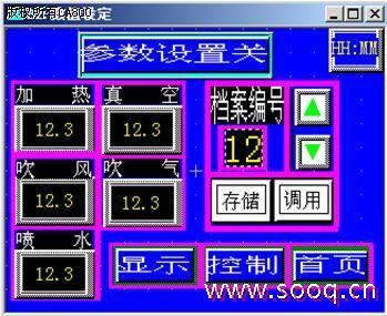 成型时间的存储和使用 不同的模型需要有不同的成型时间,所以需要PLC对不同模型的时间进行记忆。可以通过画面来进行设置和调用。该功能由触摸屏和PLC内部的寄存器配合实现。 屏幕界面如下: