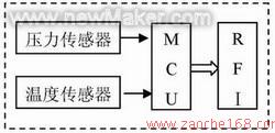 依据上述工作原理,本系统包括5个模块:4个用于轮胎内的监视模块和一个用于车内的接收模块。监视模块又包括传感器和发射模块。