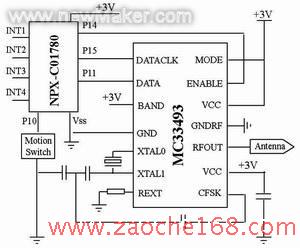 发射接口电路如图2所示。无线电发送模块MC33493可进行OOK或FSK两种调制,工作在300~450MHz频段,采用PLL频率合成技术,频率稳定性好,具有较小的发射功率,最大发射功率达 0.18mW。其数据速率可达9.6Kb/s,工作电压为1.9~3.6V,功耗低,发射时电流为11.6mA,待机状态电流仅为0.8μA(工作温度在125℃)。