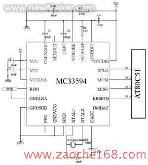 接收接口电路如图3所示,MC33594是高温集成UHF超高频无线电接收模块。该芯片的工作频率为300~450MHz,电压在4.5~5.5V范围内;接收灵敏度高达-103dBm。其最大的特点是带有一串行外设接口(SPI)。通过SPI,它允许微控制器与各种外围接口器件以串行方式进行通信。SPI接口使用四条线:串行时钟线(SCK),主机输入/从机输出数据线MISO,主机输出/从机输入数据线MOSI和低电平有效的从机选择线RESET。