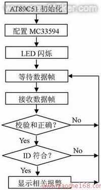 图4给出了接收模块的接收程序流程图,接通电源后,接收机先后进行初始化和配置。一旦确认接收机配置完成,所有的LED就闪烁一次告知使用者模块准备就绪。在收到一个数据帧后,就要重新计算校验并与己经接收到的数据帧进行比较。数据帧经过确认后,某个轮胎和ID则要与存储在KX8存储器中的4个ID值比较。如果发现一个相配的ID,则数据就被处理并点亮相应的LED。最后,数据帧通过串行口发送出去以供外部数据接收和存储。