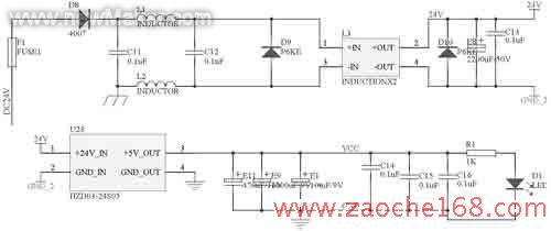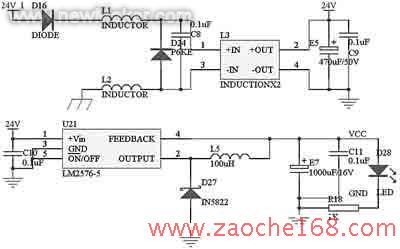 本控制模块的电源电路如图2所示。车载蓄电池—发电机的电源从24V_1处进入,二极管D16主要是防止电源的正负极被误接反。电感L1、L2对电源进行滤波,和共模电感L3、电容C8配合,可以过滤掉电源中的尖峰脉冲。二极管D24 P6KE51A是脉冲干扰抑制器(TVS),它可以快速吸收超过额定电压的尖峰脉冲,瞬时通过电流很大,最大功率可达500~1000W。电容E5和C9进一步对电源进行滤波。过滤干净的电流通过开关电源芯片LM2576变换为系统使用的5V电源。电容E7和C11对输出5V电源进行滤波,电阻R18和发光二极管D28指示当前是否有电。