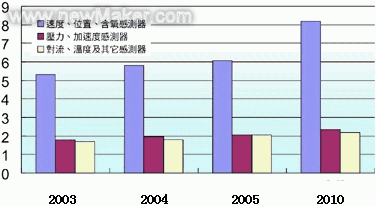 其次便是车用动力传感器,包括,速度与氧气传感器增长率为6.7%、压力与加速度传感器为5.7%、空气流量、温度与其它传感器增长率约为4.6%,年增长率约为6.2%;在所有传感器组件中,则以速度与氧气传感器产值最高,预估将从2005年的62亿美元提升至2010年的86亿美元。