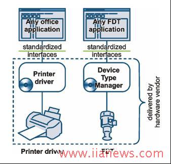 FDT原理类似于Windows中的打印机驱动程序。在FDT中这个驱动程序叫做设备类型管理器(Device Type Manager)。它被安装在Windows中,允许设备数据交换(图2)。为达到这个目的,接口被标准化并公开,允许任何供应商提供其设备的DTM。一个DTM能包含不止一个设备,例如一个全套设备系列仅需一个DTM,这使DTM的管理变得简单。