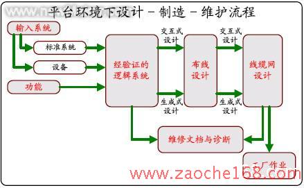 上图简要描绘出汽车平台化设计理念下从设计到维修的整个流程。流程中引入了“交互式设计”以及“生成式设计”两种理念、方法学以及配套的工具集,相关的方法学和工具面向平台层次的系统集成、互联布线综合以及线缆网工程化。目前主流OEM 厂商普遍开始采纳的流程兼具以下特点: