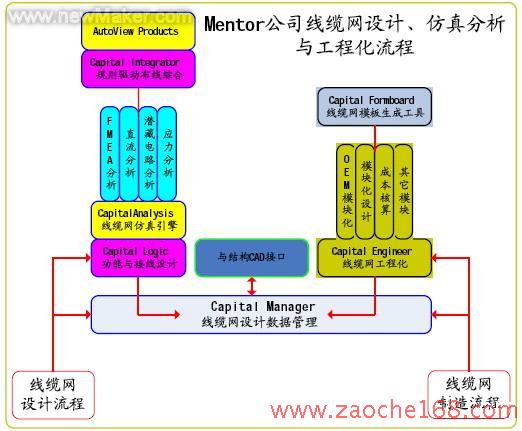 Mentor Graphics 公司不断发展和壮大其在电气系统集成以及分布式设计领域的力量,先后合并和整合了业界著名的Harness Software 公司以及Innoveda 公司的相关技术和产品,实现了快速高效率地融合,并且把上述技术和产品整合成一条完善而高性能的产品线,为行业用户带来先进的系统集成与电气系统分布式设计与工程化的集成实施环境Capital Harness System(简称为CHS),CHS 覆盖逻辑设计、仿真分析、工程化直至后期的生产制造与维护等整个流程。CHS 提供全面广泛的库管理系统,实现部件的统一管理,提高设计效率。CHS 可以实现产品设计中的派生设计以及设计选配的高效管理,同时也支持版本管理。CHS支持相关的仿真与分析机制。