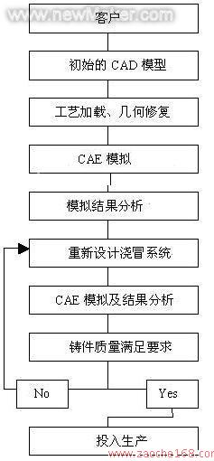 在设计过程引入CAE来指导设计决策,通过对大型复杂铸件制造工艺过程进行数值模拟及仿真,对铸造过程中流场、温度场、应力场及微观组织形貌进行模拟,从而帮助工艺设计人员对不同时刻的金属流态、凝固过程温度分布、应力分布、结晶晶粒尺寸形貌等重要物理参数有所了解,并以此为依据,预测是否有缩孔、疏松、夹杂、偏析及热裂纹等缺陷出现,可以实现铸造工艺设计--校核--再设计--优化设计的全过程,最终提高铸件质量[6],缩短试制周期,降低生产成本,提高产品竟争力。