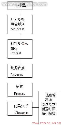 近年来,铸造CAE商品化软件功能逐渐增加,其中主要有美国的ProCAST、德国的MAGMASOFT、芬兰的CastCAE、法国的Simulor、西班牙的Forcast及日本的Soldia、Castem等软件。ProCAST软件是由ESI公司开发的基于有限元法(FEM)的铸造过程模拟软件[5],能够进行流场、温度场、应力场三场耦合模拟。ProCAST采用基于有限元法(FEM)的数值计算方法,与有限差分法(FDM)相比,有限元法具有较大的灵活性,特别适用于模拟复杂铸件成型过程中的各种物理现象。通过分析可以获得铸造过程的各种现象、铸造缺陷形成及分布、铸件最终质量的模拟和预测。图4展示了铸件工艺优化的整个流程。图5为ProCAST软件进行模拟分析的步骤。