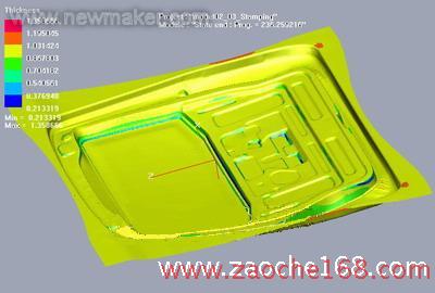 目前,板料冲压过程的计算机分析与仿真技术(非线性有限元分析技术)已能在工程实际中帮助解决传统方法难以解决的模具设计和冲压工艺设计难题,如计算金属的流动、应力应变、板厚、模具受力、残余应力等,预测可能的缺陷及失效形式,如起皱、破裂、回弹等。在汽车覆盖件的设计中采用数值模拟技术能从设计阶段准确预测各种工艺参数对成形过程的影响,进而优化工艺参数和模具结构,缩短模具的设计制造周期,降低产品生产成本,提高模具和冲压件产品品质。