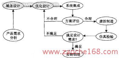 产品的虚拟设计技术(VirtualD esignT echnology)是面向数字化产品模型的原理、结构和性能在计算机上对产品进行设计,仿真多种制造方案,分析产品的结构性能和可装配性,以获得产品的设计评估和性能预测结果,从而优化产品设计和工艺设计,减少制造过程中可能出现的问题,以到达降低成本、缩短生产周期的目的。