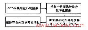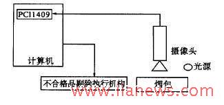 系统硬件结构如图1 所示。该系统采用NI(美国国家仪器) 公司的PCI1409 图像采集卡采集烟包外观图像。由CCD 摄像头采集的图像,经过数据采集卡转换成数字化图像输入计算机,应用程序将采集到的图像与预存的标准图像进行对比、判断,并通过相应的控制系统将存在外观缺陷的烟包从设备剔除口剔除(图2) 。