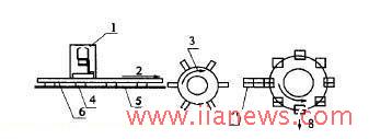 1. 检测传感组件 2. 烟包运行方向 3. 小包外包透明纸包装成形 4. 被检测烟包 5 烟包输送带 6有机玻璃盖 7烟包堆垛 8 残次烟垛剔除口