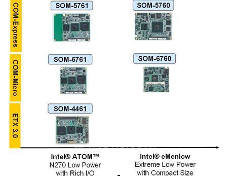 研华即将发布采用 Intel® Atom Z530 解决方案的 SOM-5760 COM-Express 模块,该模块可用于要求超低功耗、长电池寿命的消费类手持设备中。采用 Intel® N270 平台的 SOM-5761 可提供多种 I/O 接口,如 PCIe、PCI、USB 和 SATA,非常适合用于低功耗应用中。