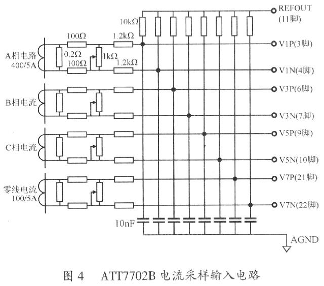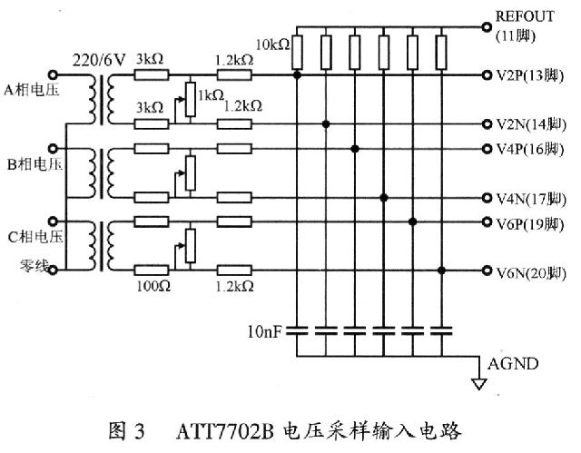 ATF7702B电压采样输入电路如图3所示,其中三相电压输入电路中元件参数相同。根据电压互感器二次电压是0.5V还是几伏来确定电压信号输入回路中的电阻和电位器。原则是电位器两端的电压能调整到不超过ATT7022B最大输入电压有效值范围。