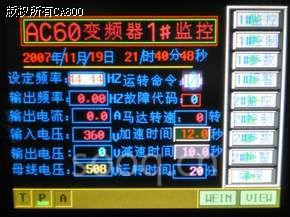 AC60型变频器采用国际标准的MODBUS通讯协议。用户不仅可通过PLC、上位机、主站变频器实现集中控制,还可以与触摸屏进行直接对话,通讯更为快捷流畅,人机界面是在操作人员和机器设备之间作双向沟通的桥梁、用户可以自由组合文字、按纽、图形、数字等来处理或监控管理的多功能屏幕。使操作变得简单生动,更加人性化。 一、AC60变频器可与多种人机进行“一屏一机”和“一屏多机”的连接通讯。下图是MR500人机与多台变频器进行通讯的画面: