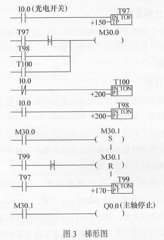 (4) 编制梯形图程序根据程序框图,开关表及动作表即可直接在编程器键盘上键人程序。编制程序可分段进行,先编制自动循环程序段、手动调整程序段、初始化程序段,后分段模拟运行调试后串联起来。运用转移、标号指令,可将复杂的程序分解成功能程序段,有利于程序编制及调试。以半自动车床自动循环与手动调整程序为例,若开关1127为手动/自选择开关,可按如下方法编制程序(见图3):