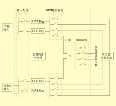 两组UPS通过负载同步控制器达到同频率、同相位的输出 。这样利用STS时候就能达到零转换。使后端单电源供电的负载能得到最大的保护。