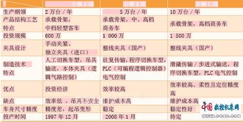 对于焊装线结构形式的选择,最需要考虑的是生产纲领、产品结构和工艺特点、投资规模和夹具设计制造技术水平以及厂房等情况,在细部结构上要结合产品的寿命周期、市场定位和质量要求,并对相关因素进行综合比较来进行选择。全顺厂焊装车间有全顺A线、全顺B线,未来要规划全顺C线,我们将这三条线做个比较(如表)。