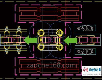 本体夹具采用平移式结构,每种车型配有一套侧围定位机构,分别存储在生产线的两侧,需要时前后移动到中间工作通道(如图5中间部分),换下的夹具从中间通道移到前后存储的位置,图5中可以存储4套定位侧围夹具,也能用新的夹具替换原来的夹具,增加了跟随市场变化的能力。