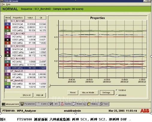 ABB WPA分析仪具有FTSW 100 过程控制软件,专为过程监测与控制而设计。该软件具有较高的灵活性,可对清洗、蚀刻、剥离溶液中的每种化学组份浓度进行实时监测。如图4所示,化学组份浓度及变化趋势皆可实时显示。