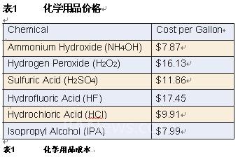 化学计算过程均依据百分之百工时计,无闲置期,即每日近96次。表1说明了每加伦的化学用品价格。