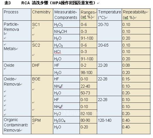 表3汇总了RCA清洗流程,该流程将多种方案与每种方案中的化学组份、组份浓度范围、操作温度、复用性等相结合。