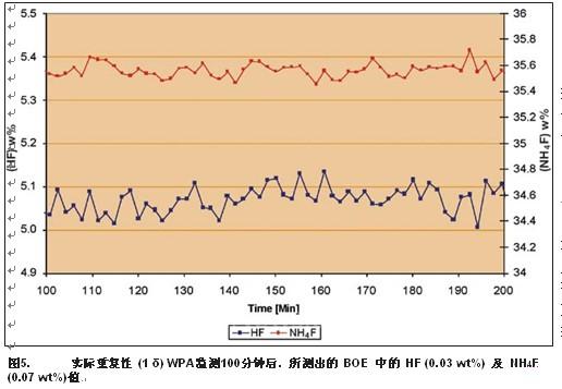 WPA具有极高的重复性。RCA流程中的典型分析效益数据可见表3。表中所列数据经常得以优化,以提高流程效益,正像表5所示,BOE清洗槽中的HF和NHF4的重复性可降至0.1%以下。对于HF监测,目标浓度为5wt%,而WPA可遵循该标准,如果相对重复性为0.6%,它可将绝对重复性复性标准降到0.03%。对于氟化铵,目标浓度应为35.5wt%,若相对重复性为0.2%,绝对重复性可降低0.07%