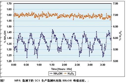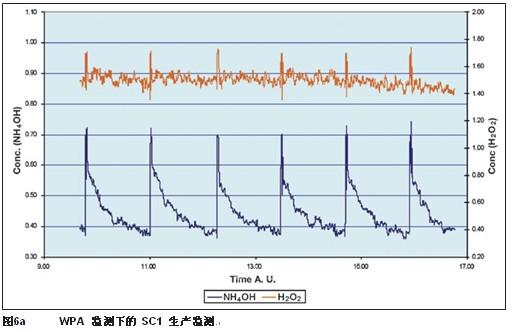 在SC1中,主要过程控制参数为氢氧化铵。WPA可监测氨水的浓度变化,在达到峰值后,可将浓度值反馈给操作人员。由于在线,实时取样和响应时间短,另外还能够提供严格过程控制所需的重复性,所以WPA可很好地监测和控制该种化学组份。