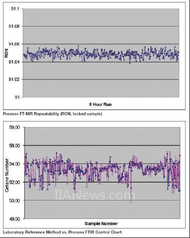 对于操作人员来说,FT-NIR分析仪在汽油柴油质量测量中提供的优异的可重复性是极为重要的。只有在有可靠性和重复性的情况下,分析仪才能精确发现调合流程中调合性质的细微变化。由于噪声影响的结果,这些变化转瞬即逝,传统的分析方法可能会无法将其体现出来。由于确信已经发生了性质偏差,操作人员或者是多参数监控系统需要对流程进行相应的调整,以维持优化调合的质量。另外,由于同传统的实验室方法相比,重复性大为提高,这就意味着质量损失将大为降低。请参考下图给出的RON(研究法辛烷值)实例。