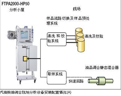 实例A:成品调合分析设备配置情况。此实例显示的是安装在分析小屋中的一台双检测池的在线FT-NIR分析系统。其配备有快速回路、样品预处理系统和冲洗/校验系统。组份油通过流路切换选择进行分析。调合组分油和成品油使用各自独立的样品测样池。