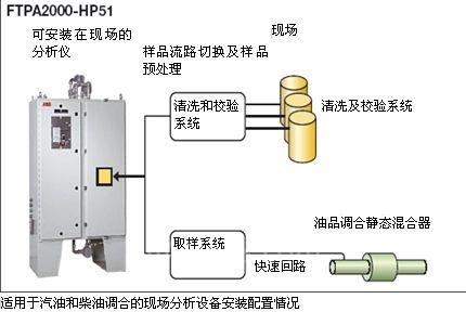 以上图示显示的是ABB成品调合FT-NIR系统的典型配置情况。需要更多的详细信息,请参阅适用于FTPA2000-HP50,-HP51及 -HP52系统的HPI FT-NIR解决方案数据表参考手册。