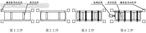车厢边板类焊接总成一般由4 个工位来完成,整个焊接过程形成一条流水线。各工序间焊后产品的传递采用滚道式运输方式传送,滚道传输高度距地面均为900mm。下面以边板为例介绍一下各工序焊接内容。(见图2)。