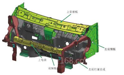 五菱荣光前部结构由上弯梁、前隔板、上安装板、左右侧板、左右灯罩总成、上弯梁及一些安装支架所构成(见图1),它与前车架共同组成前舱,主要起着安装零部件和车身附件的功能;上安装板与前侧围、前顶盖横梁构成前风窗,给前挡风玻璃提供安装面;前隔板、左右侧板与地板、侧围、顶盖构成乘载空间,对乘客和货物起保护作用。