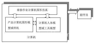 虚拟演示是用虚拟设备和技术进行维修性演示的一种过程和技术,虚拟演示与计算机演示有很大的区别。一是在硬件使用方面(如图8所示),计算机演示不需要计算机以外的其他复杂设备,而虚拟演示依赖计算机以外的其他虚拟设备和技术。二是虚拟演示在技术上具有鲜明的投入(Immersion)和交互(Interactivity)的特点,因为投入性和交互性是虚拟仿真赖以生存的二个关键因素[13-16]。这种要求使得虚拟演示与计算机演示过程的构成具有明显的差别,虚拟演示的操作者直接参与维修作业,而计算机演示的操作者不能直接参与维修作业;前者是人在环维修仿真,而后者不是。虽然后者在操作过程中程序员与计算机也有交互作用,但是这种交互是程序员与系统程序和控制程序之间的交互作用,程序员不能直接参加维修(如图9所示)。