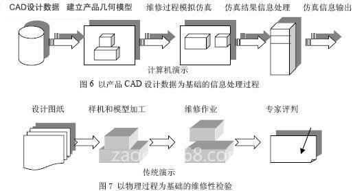 由图3和图5所示情况可以看出计算机演示与传统演示虽然都是通过维修操作过程试验检验产品的维修性,但是其过程已经发生了很大变化。两者的主要差别是计算机演示用计算机图形模型代替了产品模型和样机,用计算机人体模型代替了维修人员,用维修过程计算机仿真代替了实际维修过程,用计算机专家系统代替了实际专家指导,用计算机模拟维修环境代替了实际模拟维修环境。一句话,传统演示是在真实的物理条件下进行,而计算机演示只是在计算机上进行。这些改变使得过程的性质发生了根本的改变,这种改变是一种质的飞跃。原来主要以物理过程为特征的传统演示过程变为以产品CAD设计数据为基础的信息处理过程,两个过程的对比如图6和图7所示。