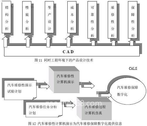 (2)汽车维修性计算机辅助分析(Car MCAE)和汽车全数字设计河开发是在同时工程环境下进行产品设计的一项重要技术(参阅图11),图中所示内容也表明其设计流程和两者之间的关系也很明确。同时,汽车维修性计算机辅助分析也是汽车维修与保障系统Car CALS发展的一个重要基础(参阅图12)。