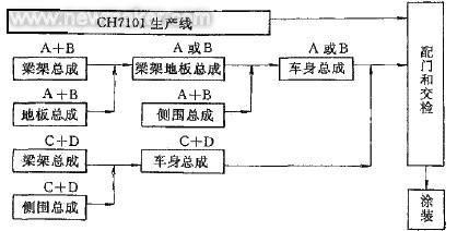 混线生产又称柔性生产,是企业生产中一种较常见的生产组织形式。近年来,汽车行业实行混线生产也很多见,但通过对国内汽车生产厂家混线生产的品种数量进行比较,我公司焊装车间实行)大品种多系列的混线生产模式,在国内还是仅有的一家。目前, 公司现有) 大品种车型, 即厢式排(CH1012L)、厢式双排(CH1011)、厢式前凸车(CH6370)、厢式平头撞(CH6353)和“爱迪尔”轿车(CH7101),且每个品种车型又分若干个系列。公司通过多年来对焊装的夹具、设备、生产线的技术改进和管理创新,在焊装车间1.4万平方米的工房内成功地实现混线生产,其混线模式如焊装主线工艺流程图所示。