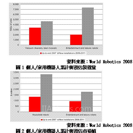 至2007年底为止全球家务用机器人计有340万台,娱乐休閒用机器人200万台;2008~2011年全球预估将有家务用机器人460万台,娱乐休閒用735万台,合计约1仟2佰多万台安装量,未来四年市场总值合计约57亿美元。(参见图1、图2)