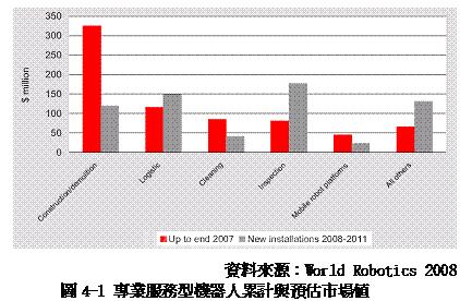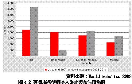 至2007年底为止有49,000台的使用数量,较2006年底的39,900台增加约9,100台。预计2008~2011年将增加54,000台专业服务型机器人,总价值约91.2亿美元。(参见图3、图4)根据IFR统计资料显示:至2007年底为止,全球专业服务型机器人累计装置数量为49,000台。其中包括水底作业系统、专业清洁、建筑与拆除机器人、医疗机器人、机器人移动平台、农林矿牧、防御救灾与保全、物流、检验与公共关係等用途,总市场值约近78亿美元。专业服务型机器人的应用范畴殊异且单价差距颇大,有低于1万美元者,亦有高于30万美元者,视其应用领域的功能要求而定。水底作业系统的单价最高,从30万美元至超过100万美元均有,属于最昂贵之类型;其次为医疗用机器人,约自10万美元至数百万美元。