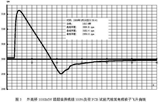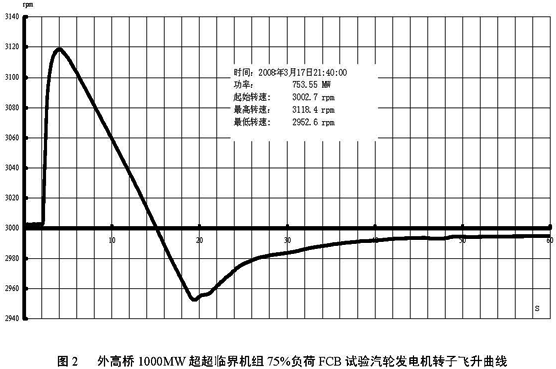 08 年 3 月巧日和 16 日,外高桥三期工程第一台机组先后进行了 75 %和 100 %的甩负荷试验。试验采用全真运行工况,试验前不作任何预防性措施和操作,唯一做的就是拉开发电机出口开关。这两次试验都获得了成功。通过试验,也发现了控制系统内尚存的个别不足,经修改逻辑后于 3 月 17 日晚 21 : 40 进行了全真运行工况的 75 %负荷的 FCB 试验。这次试验非常成功,所有运行参数都很平稳,汽轮发电机转子在主变压器出口开关拉闸的 2s 后转速达到 3118.4 rpm,17s 后降至 2952.6 rpm,约40s 后转速趋于稳定,见图2。由于再热安全门没有开启,工质平衡不存在问题。在这次试验中,按计划还要做50OKV线路开关和联络开关的假并列试验,故孤岛状态运行了近一个小时,于22:39:07再次并网。这次试验还说明,机组完全可以在孤岛状态下安全运行较长时间。