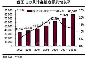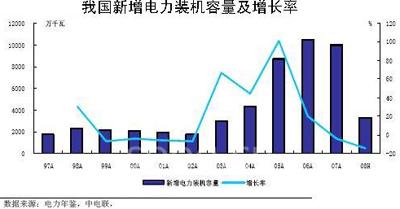 2002年电力体制改革之后,我国电力工业获得了空前发展。在2004年实现4亿千瓦发电装机的基础上,自2005年起,我国发电装机容量每年跨越1亿千瓦平台,先后实现了5亿、6亿、7亿千瓦的历史性跨越。自2002年至2007年五年间,我国新增发电装机规模约3.5亿千瓦,相当于建国至2002年50多年的总和,也相当于英国、法国、意大利三个发达国家电力装机的总和,创造了世界电力发展史上的奇迹。2008年中期,我国电力装机容量达到74000万千瓦(上半年关停小火电836万千瓦)(如图1),但新增电力装机容量增速明显回落。2008年上半年,新增电力装机容量3302万千瓦,比去年同期少增长536万千瓦(如图2)。2007年,我国完成电源投资3041亿元,同比下降4.81%,是继2006年之后,连续两年下降。2008年上半年,我国仅完成电源投资1337亿元。