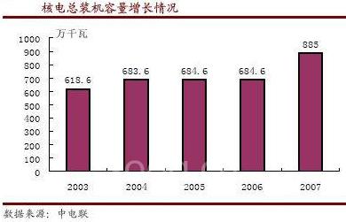 截至2007年底,我国大陆地区核电运行机组达到11台,运行总装机容量达到907.8万千瓦,比2006年增长了200万千瓦,2003-2006年基本没有增长(见图8)。国家原子能机构的统计显示,2007年,我国核电总发电量628.62亿千瓦时,上网电量为592.63亿千瓦时,同比分别增长14.61%和14.39%。其中,中国广东核电集团全资和控股的核电机组4台,装机容量394.8万千瓦,占全国核电总装机容量的43.5%。我国目前有秦山一期、秦山二期、秦山三期、大亚湾、岭澳和田湾等6座核电站的11台核电机组投入运行。