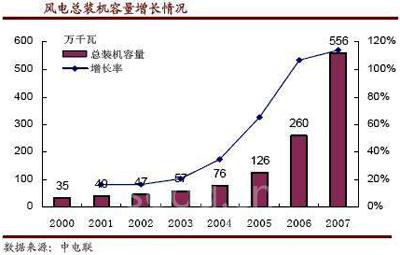 但截至2006年底,我国风力发电的装机容量仅占电力总装机容量的0.42%,出于改善过于依赖煤炭资源的状况和考虑到环保压力,中国风电装机容量占电力总装机容量的提升空间很大。根据我国的可再生能源发展规划,2010年、2020年风电的发展目标分别为1000万千万和3000万千瓦。结合我国风力资源状况,风电作为最具大规模商业开发前景的可再生能源必将得到超常发展。可以预测,到2010年我国实际的风电总装机容量将达到2000万千瓦,2020年将达到8000万千瓦。