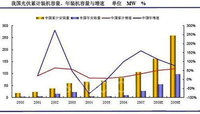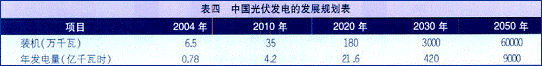按照我国《可再生能源中长期发展规划》(见表4),到2010年中国光伏发电的累计装机将达到350MW,到2020年将达到1.8GW,到2050年将达600GW。按照中国电力科学院的预测,到2050年,中国可再生能源的电力装机将占全国电力装机的25%,其中光伏发电装机将占到5%,增长空间巨大。