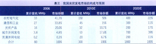 我国光伏发电的市场主要是通信和工业应用、农村电气化和边远地区的离网发电应用等,近53.8%属于商业化市场(通信工业应用和太阳能光伏产品),其余的均需要政策扶持的市场,如农村电气化和并网光伏发电。我国光伏发电市场的构成与预测见表3。