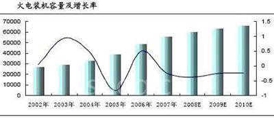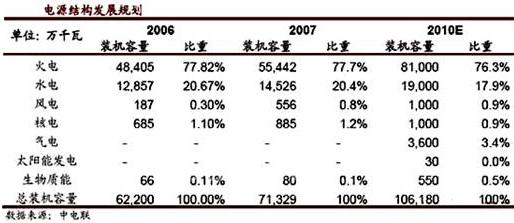 从电力结构看,目前火电在我国现有电力结构中占据绝对的优势,占全国总发电量的比重达到83%。虽然短期内以火电为主导的格局难以改变,但出于对煤炭资源未来供应能力的担心,以及火电厂对于环境的危害,我们认为国家今后在可再生能源方面投入将相对较多,火电在整个电力结构中的比例逐步下降将是必然趋势。