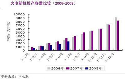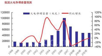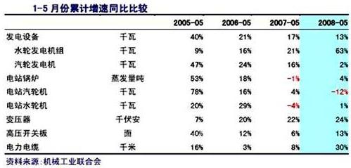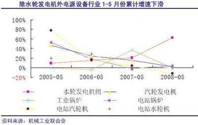 从统计数据看,与火电相关的锅炉、汽轮机等发电设备受火电需求增速放缓的影响,与前几年电力短缺带来的高速增长相比,2007年增速较前几年已经明显下降。进入2008年,锅炉、汽轮机等产品下滑的速度更为显著,锅炉产品08年4月份同比增长为-28.18%,汽轮机产品2008年4月份同比增长-29.17%。